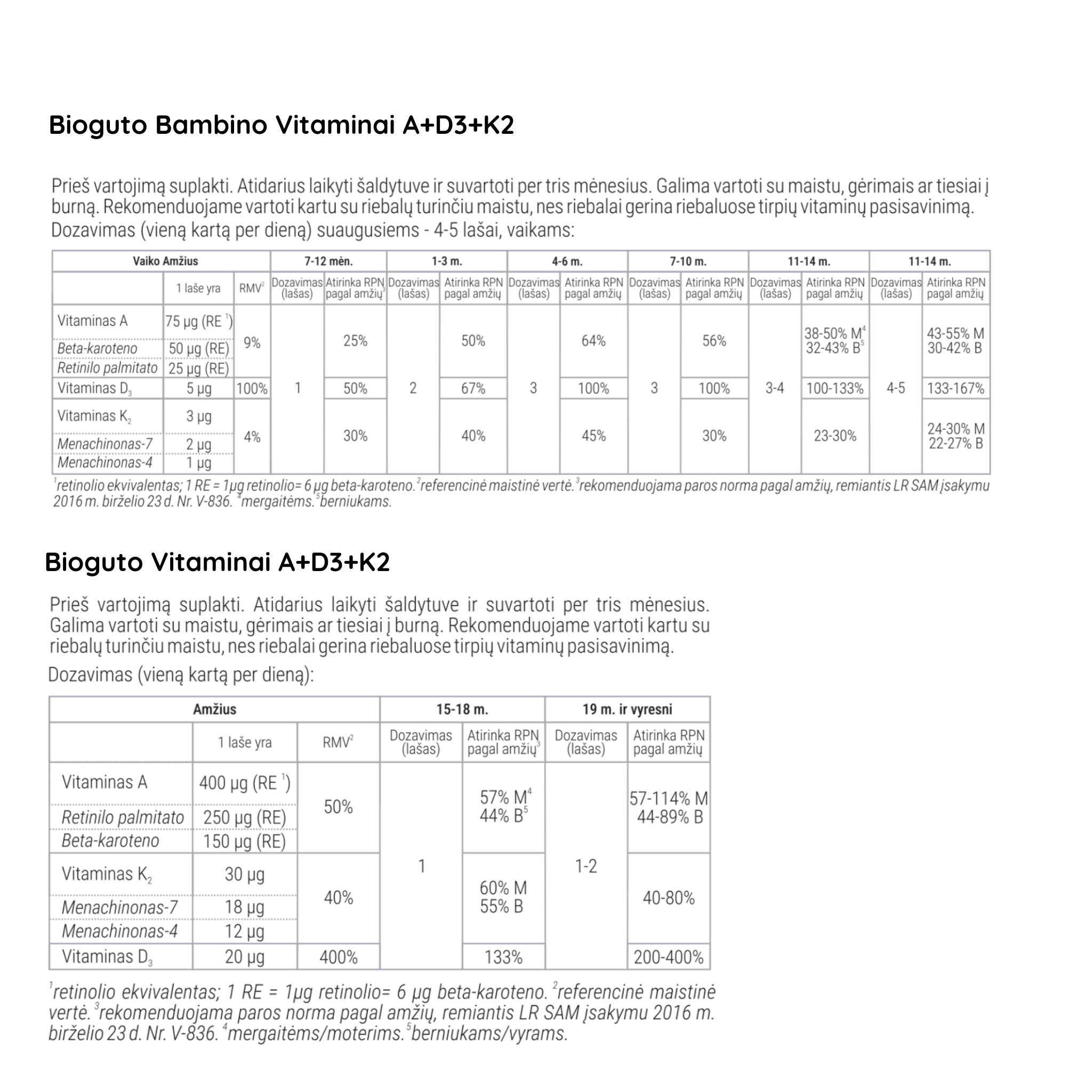 Įspėjimas: Bioguto Bambino Vitaminai A+D3+K2 bei Bioguto Vitaminai A+D3+K2 nėra maisto pakaitalas. Neviršyti nustatytos rekomenduojamos dozės. Svarbu įvairi ir subalansuota mityba bei sveikas gyvenimo būdas.